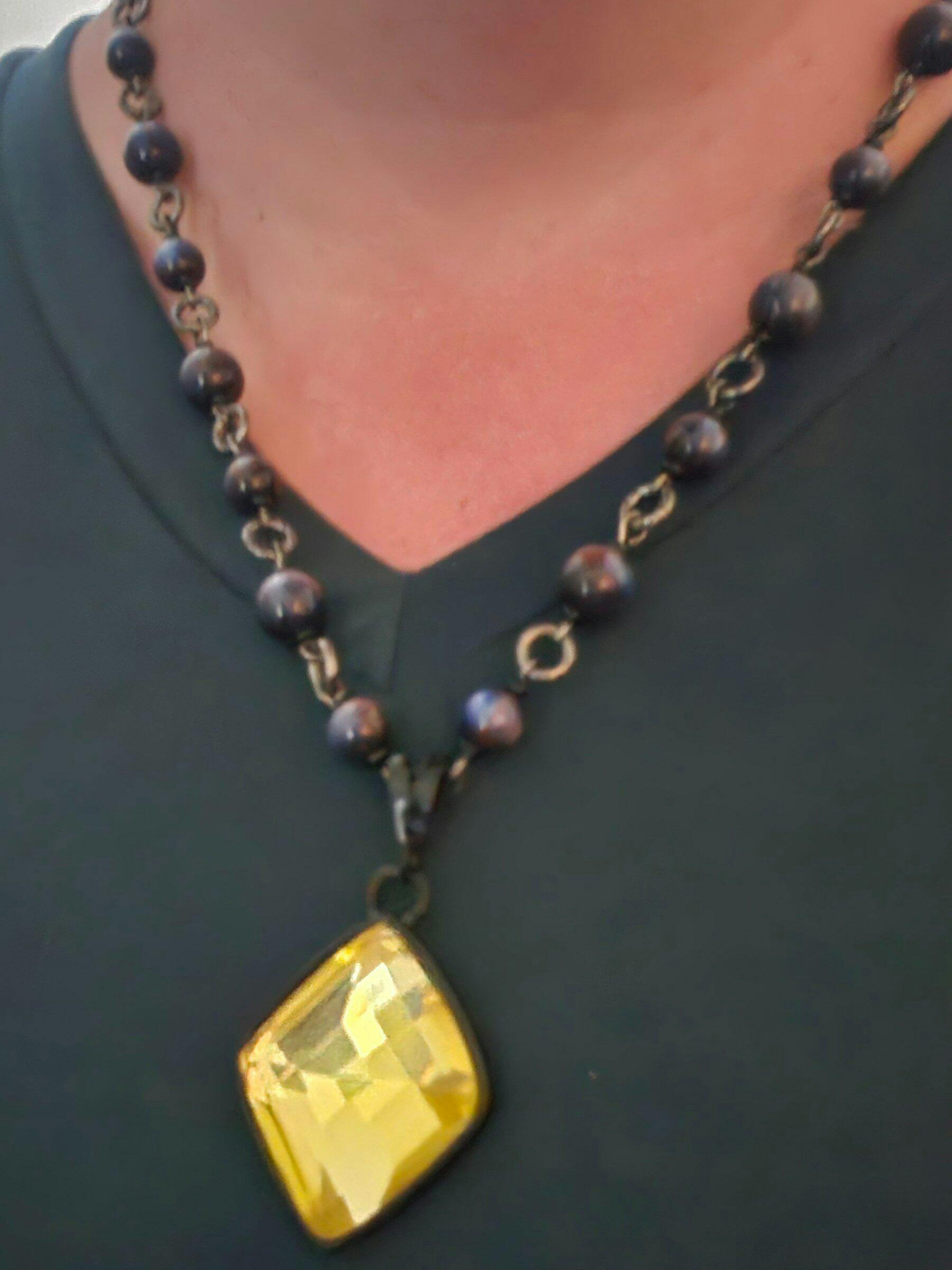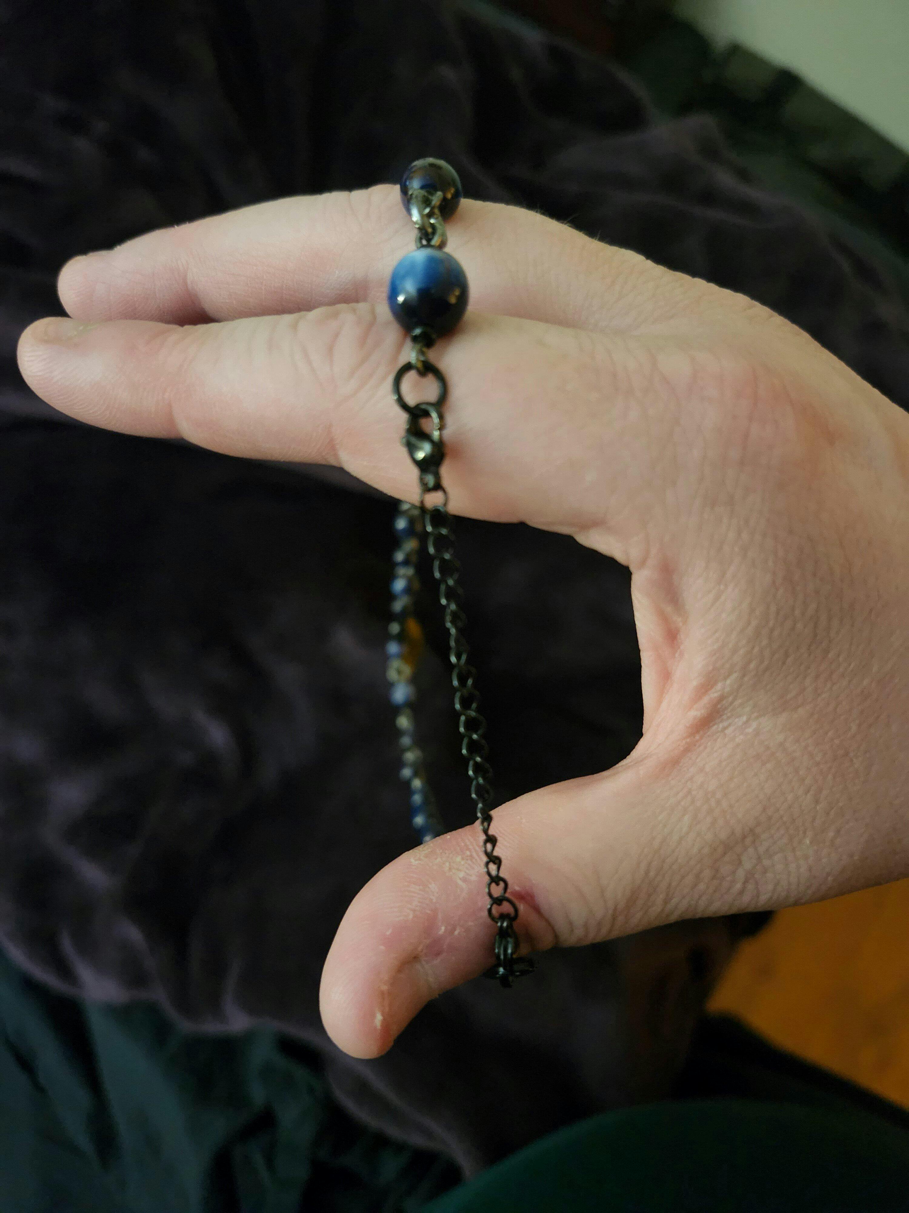 great necklace, beads are nice (I tend to go for stone or glass, but these are nice), put a necklace extender from Amazon(was able to find a good one in black) on so it would fit around my head and give a good length around my neck