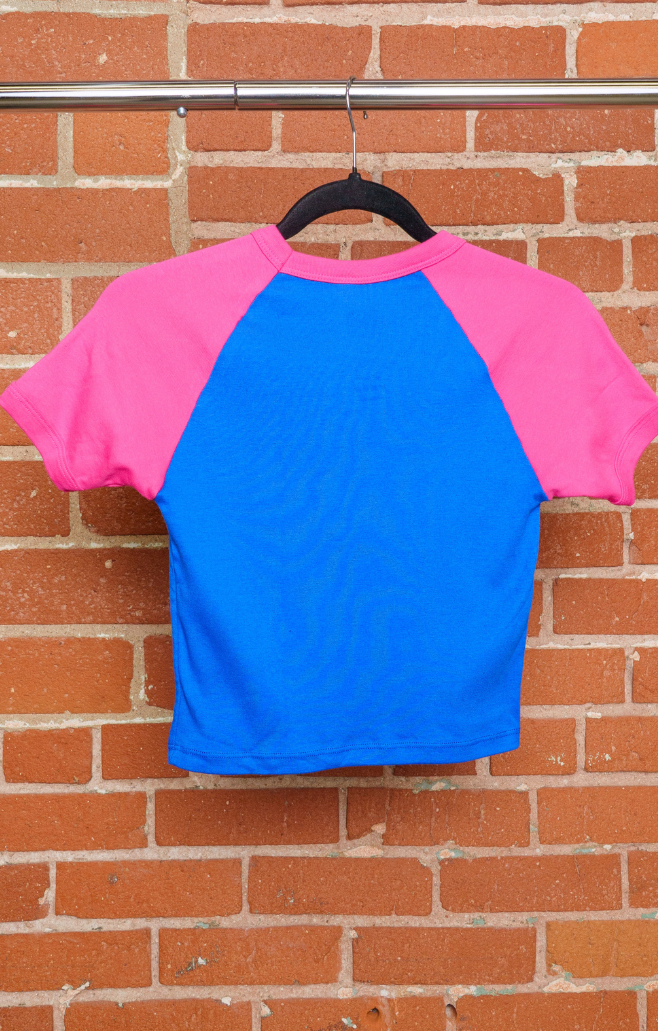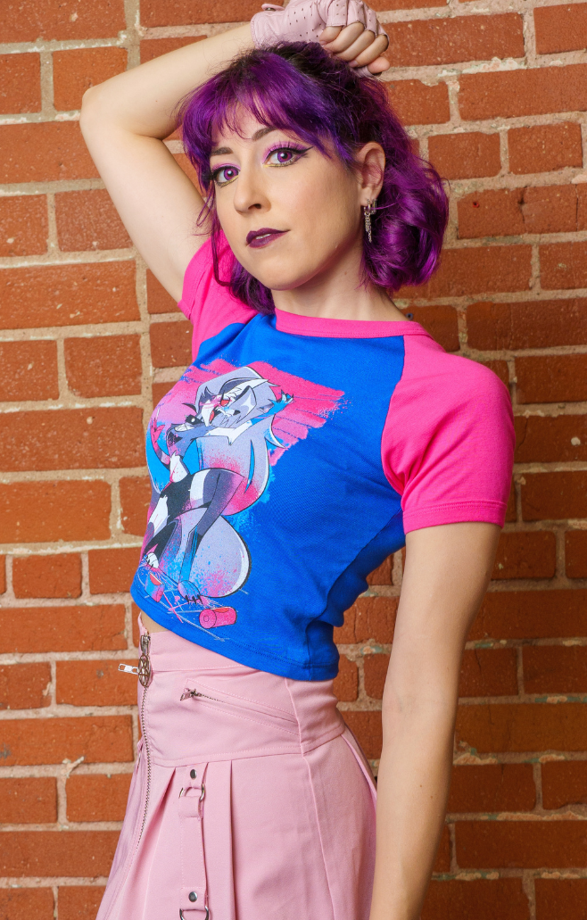 Let your Pride HOWL with our Loona Raglan Micro Ribbed Baby Tee! This flirty, form-fitting top features playful raglan sleeves and a deliciously soft ribbed texture dripping in neon purple, blue, and magenta colors representing the bisexual flag, this baby tee represents a proud and rebellious spirit worthy of any Hellhound!