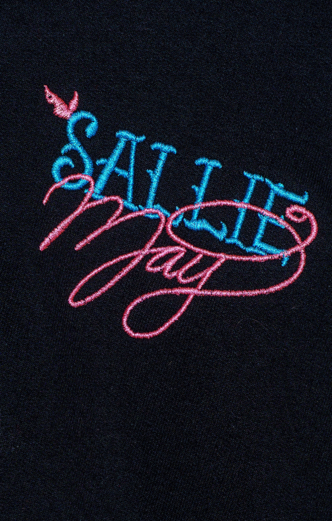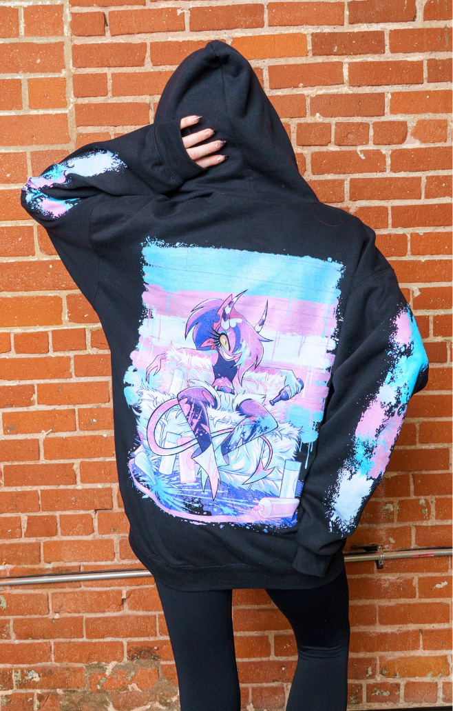 Bring some Wrath Ring style to Pride Month with this exclusive Sallie May Zip-Up Hoodie. This badass trans pride-inspired hoodie features Sallie Mays name in intricate country flair embroidery across the chest, with eye-catching pastel splatter graphics adorning the sleeves, and our wrathian babe lounging confidently in front of her trans pride flag colors on the back. This comfortable yet spicy hoodie radiates an energy that screams YE-FUCKIN-HAW!!