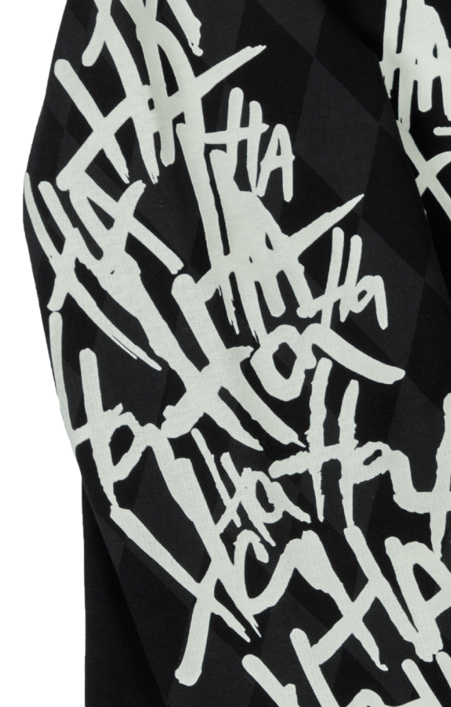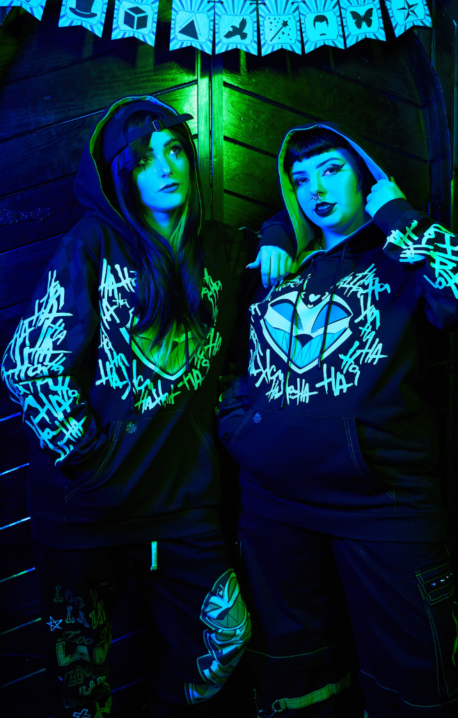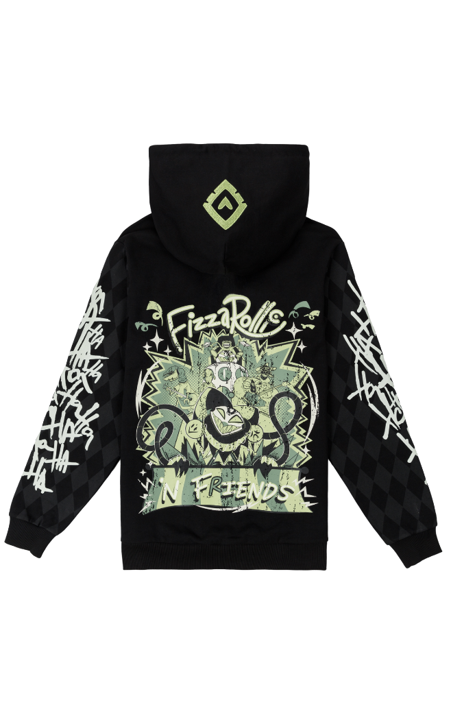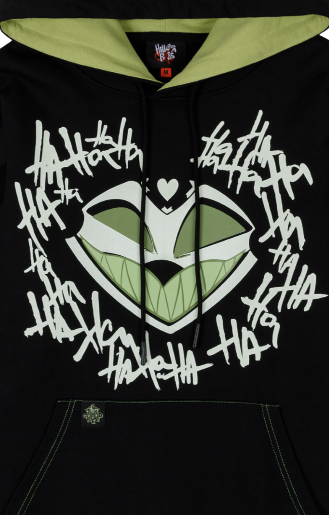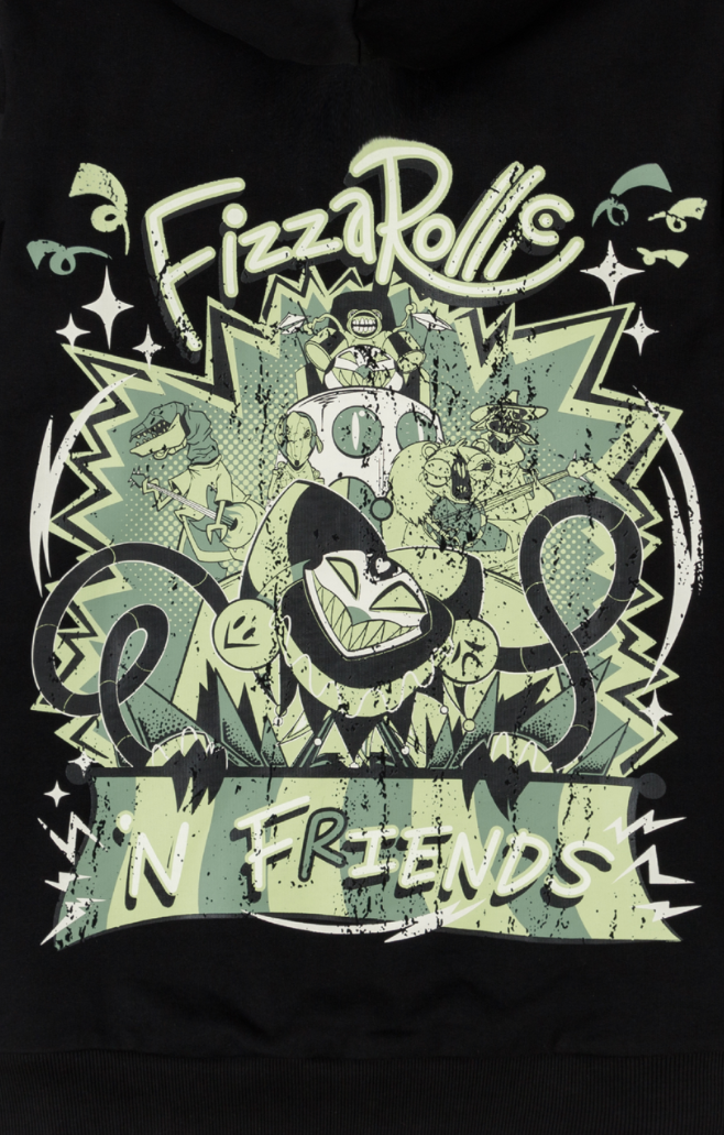 HAHAHAHAHAHA!! Show your love for the ruler of the Loo Loo Land stage, ROBO FIZZ, with this Glow-In-The-Dark Hoodie that'll leave folks in literal and figurative stitches! With a Greed Ring green glowing print, double lined hood, checkered sleeves, a shot of our iconic house band on the back, and embroidery that’ll light up the surprisingly more flammable than we thought audience, this hoodie is a fashionable indulgence that would make Mammon proud!