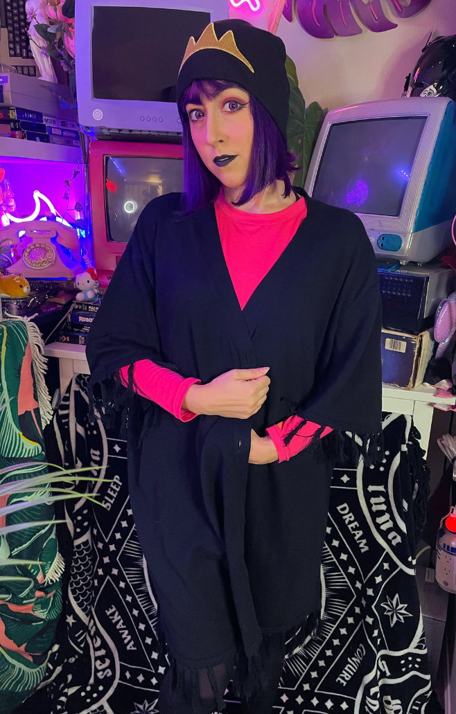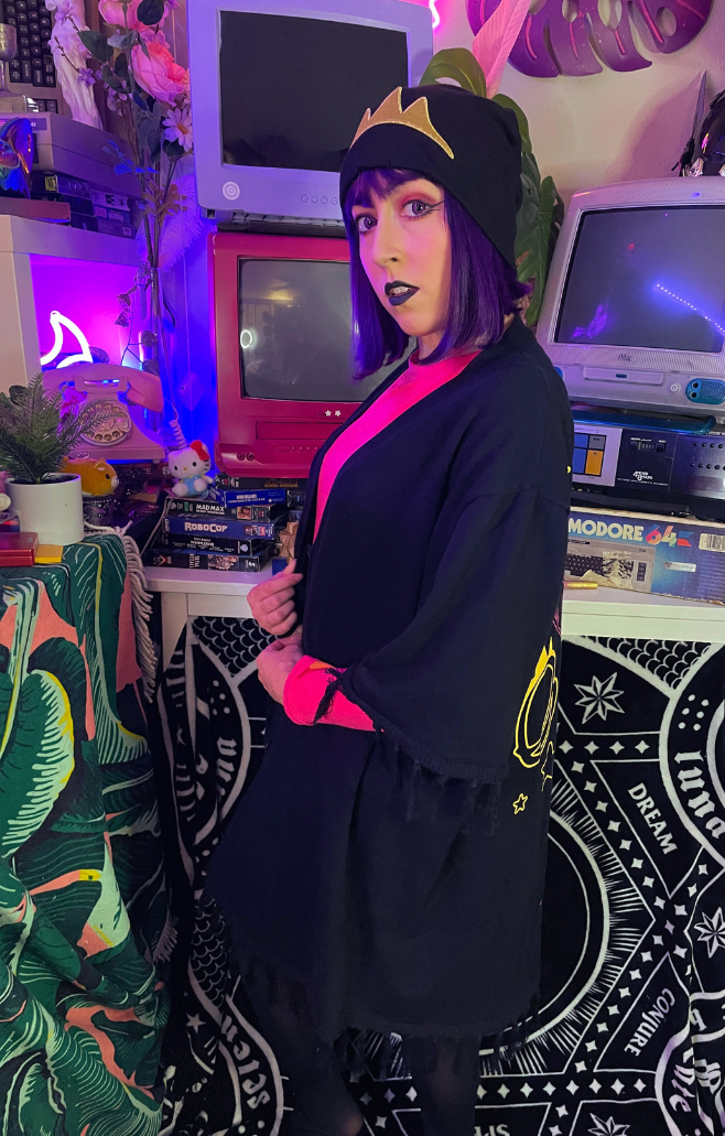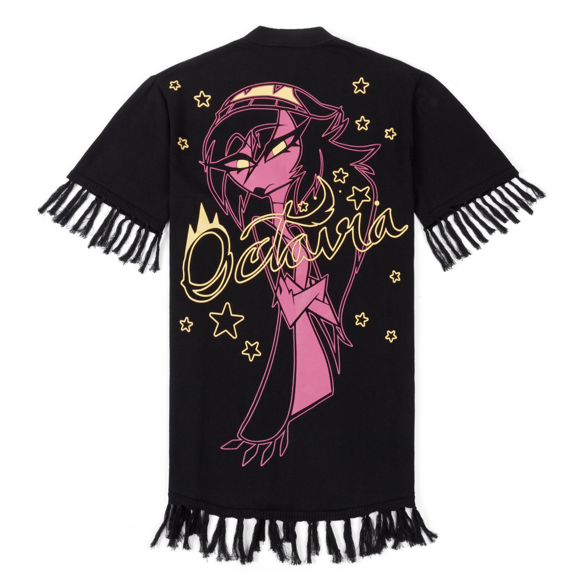 Wrap yourself in moody elegance with Octavia’s Celestial Black Cardigan. Featuring a stunning graphic of Octavia on the back and chic black tassels along the edges, this cardigan blends gothic sophistication with cozy comfort. Perfect for layering, it’s a must-have for fans who want to channel Octavia’s quiet, celestial charm while staying effortlessly stylish.