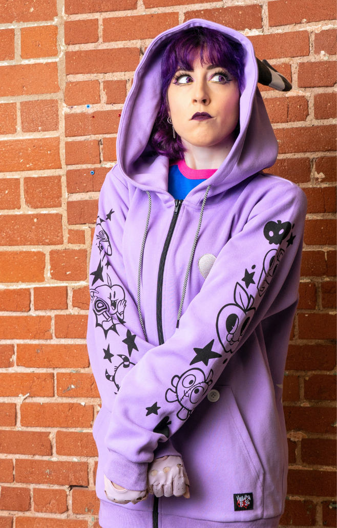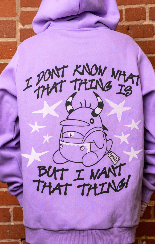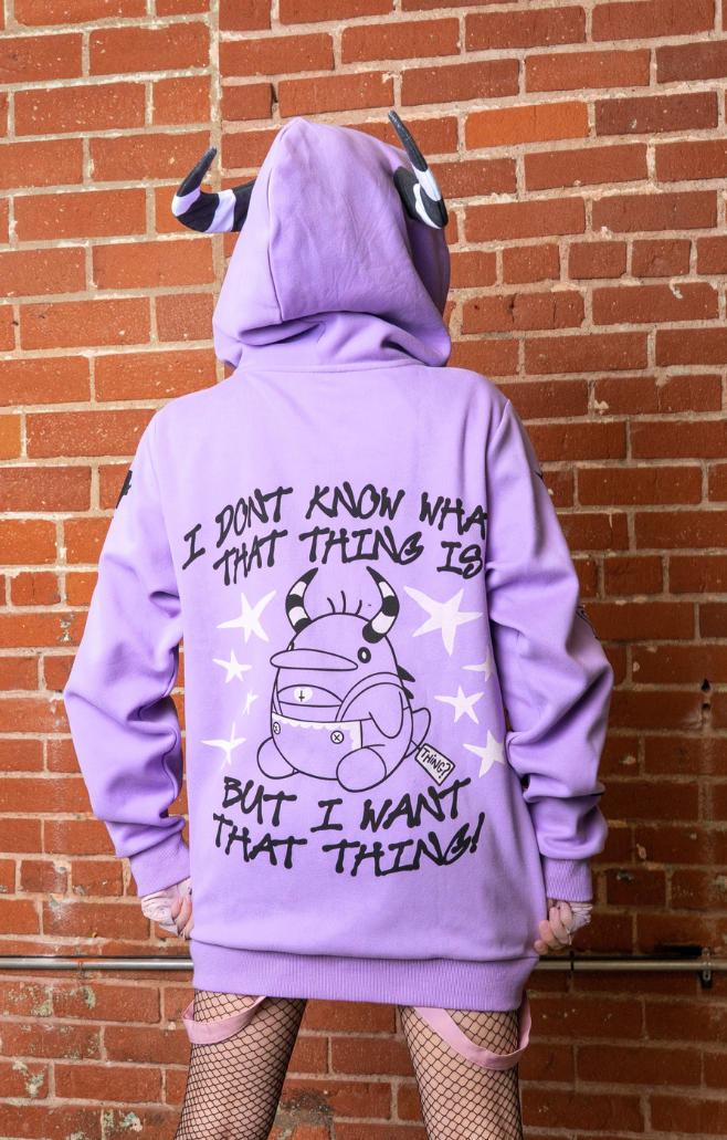 Don’t just desire the thing - BECOME the Thing! This Zip-up Hoodie will fulfill all your long-time extremely niche desires to look like your favorite hard to win carnival stall plushie! With a soft cozy feel, sharp graphics, and horned hood this Thing hoodie will have you umm…making…whatever sound one of these things makes. A joyful one. The kind you make when you’re happy you bought a cool hoodie. That one.
